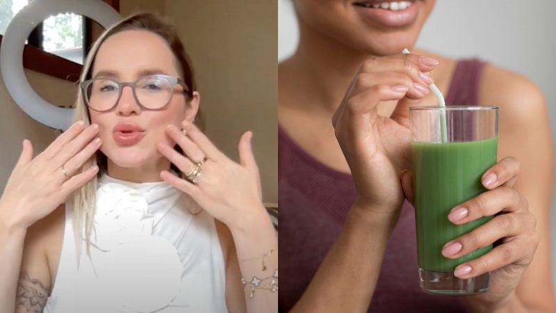 Imagem mostra, do lado esquerdo, dra Bruna falando sobre o suco detox para a pele; já do lado direito, imagem ilustrativa mostrando mulher com um suco verde na mãoMédica ensina a fazer suco detox rejuvenescedor que pode ser tomado todos os dias – Foto: Reprodução/Freepik/ND