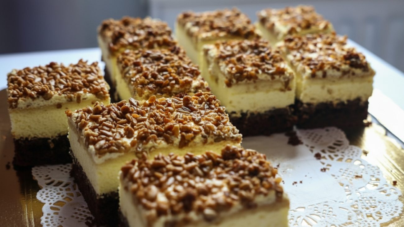 Fatias de bolo cremoso com três camadas, com base de chocolate, camada central de creme claro e cobertura crocante caramelizada, dispostas em uma bandeja decoradaO bolo cremoso de três camadas é super fácil de fazer Foto: Imagem gerada por IA/ND Mais